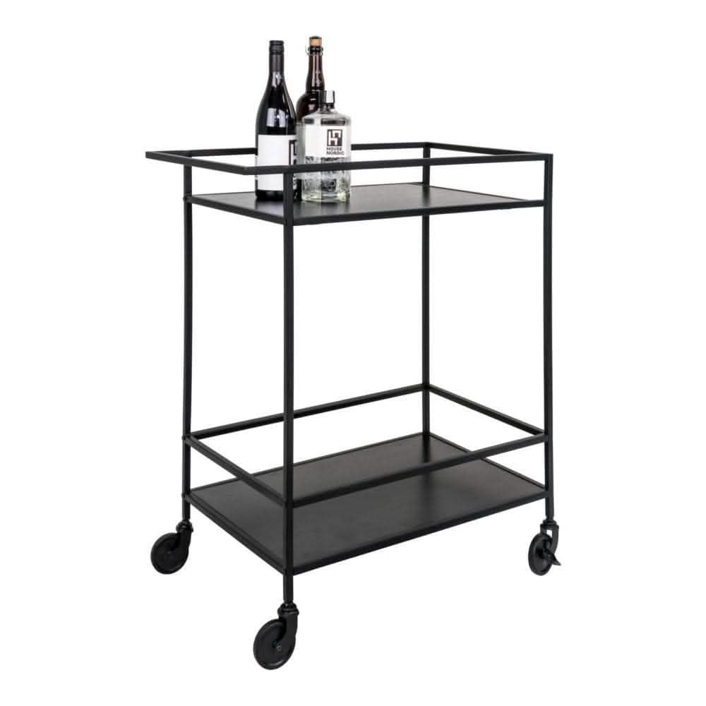 Vita Barvogn med sort ramme på hjul og to sorte hylder. Information: Længde: 40 cm Bredde: 60 cm Højde: 79 cm Nettovægt: 8.5 kg Leveres: Adskilt Materiale: Stål, spånplade, melaminfolie Maks belastning: 10 kilo pr. hylde